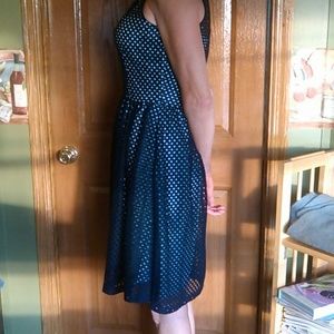 Cute navy blue dress with side zipper. Can be dressed up or just worn casually. Never worn. Model is 5'10
