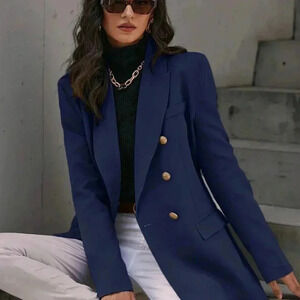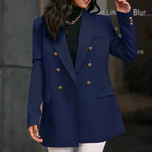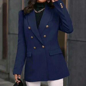 Navy Blue Elegant Women's Double Breasted Flap Detail Workwear Blazer