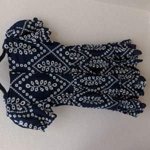 NWOT- Francesca's navy blue dress with white embroidery. Has a v-neck with puffed short sleeves and a tiered detail. Zipper in the back