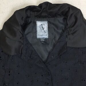 Navy blue cotton Eyelet short sleeved jacket with black satin collar and cuffs - size small - gently worn, no flaws