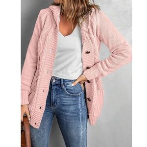 Faux Sherpa Knit Hooded Cardigan Front Pockets Long Sleeves Hip Length Buttoned