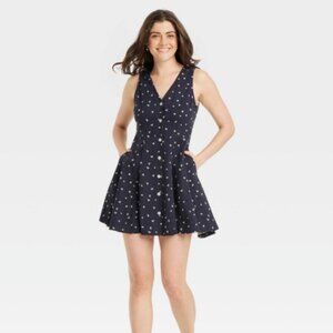 Navy Blue Floral Button-Front Godet Mini A-Line Dress XL - New without tags