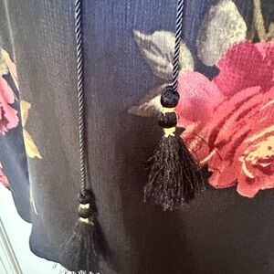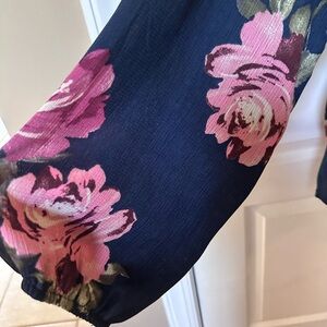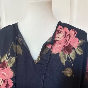This gorgeous navy tunic features a stunning pink floral pattern and elegant mid-arm ruffle sleeves for a touch of feminine charm. Perfectly versatile—pair it with denim shorts and sandals for a casual vibe or dress it up with white skinnies or tailored pants for a polished look. A must-have for any wardrobe!