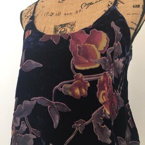 Dark navy blue velvet/velour cami/tank top with burnout floral print and adjustable straps. Lined. Excellent preowned condition and from a smoke-free home.
