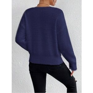 Navy Blue Fuzzy V-Neck Pullover Knit Sweater Long Sleeve