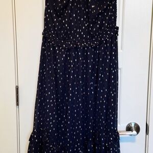 Purchased in Turkey. Navy blue dress featuring gold polka dots. Stretchy and tiered. Perfect for a night out!