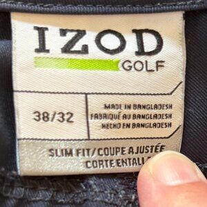Comfortable and practical Slim Fit 100% Polyester Pants by Izod Golf in classic navy blue which will pair well with so many golf shirt color and design options. These slacks include Comfort Waistband with button closure and zip fly, Front Slash Pockets, Rear Patch Pockets, Side Leg Hem Vents and Knee Darts for ease of movement. Easy care machine washable and machine dryable. Size 38 Waist, 32 Inseam with measurements taken flat and unstretched: Waist 18 1/2", Front Rise 11 1/2", Inseam 31". In Excellent Preowned Condition!