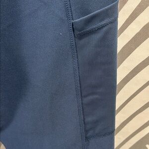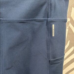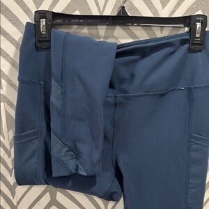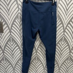 These navy blue leggings feature a high waistband and a stretchy, form-fitting material for a secure and comfortable fit. The full-length legs taper towards the bottom. Side pockets.