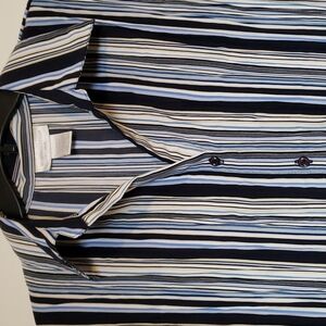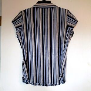 Navy Blue, Light Blue, White & Tan Stripped Shirt. Navy Blue buttons. Lightweight. Smoke free home.