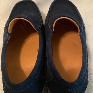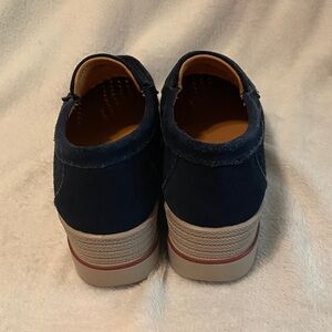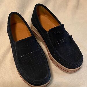 Stylish navy blue loafers with perforated design and gray soles. Comfortable and versatile. Slight platform sole. Suede material