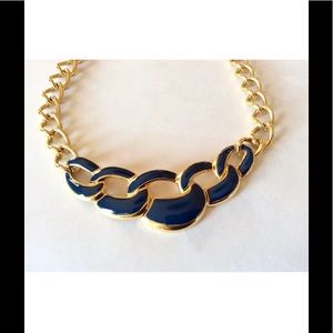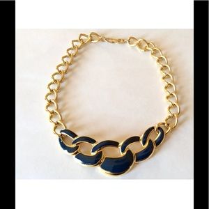 This listing is for a Napier 1990's Navy Blue Enameled Choker. The choker features a goldplated enameled metal center piece in a nautical rope motif. Necklace measures approximately 16" in length.