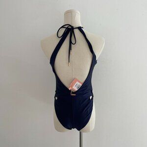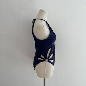 Navy blue one piece swimsuit with cut out details