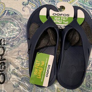 Brand new with tags and bag, never worn, genuine Oofos flip-flop sandals. They are a true NAVY BLUE in color. Very comfortable and wonderful for people with foot issues or pain. You can wear these sandals all day, every day and your feet will love them. They are unisex SIZE 8 for women and SIZE 6 for men.