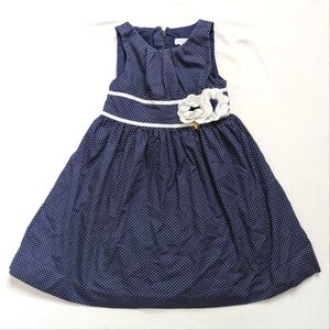 Charming navy blue and white polka dot dress perfect for any occasion. Features a stylish floral accent at the waist. Ideal for adding a touch of elegance to your child's wardrobe.