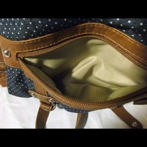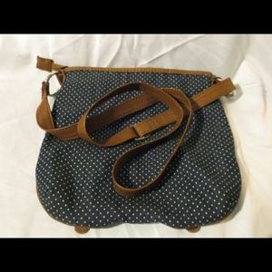 This small, messenger bag-style purse is navy blue with small white polka dots and brown PVC trim. There are two decorative buckles on the front as well as a long adjustable strap and five pockets: one on the outside, one main pocket, and three on the inside. The outside pocket and the main pocket both have cute little knots/tassels on the zipper. Cotton-polyester-spandex blend, excluding the PVC.