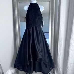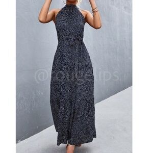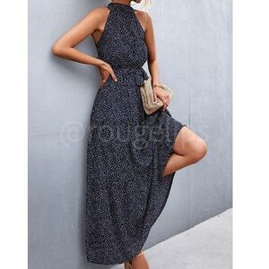 Navy Blue Polka Dot Halter Maxi Dress Tie Belt Long Flared High Neck - Medium
