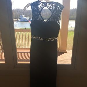 full length dress with lace body and lace inset at waist. Size 4, not altered