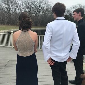 Navy Blue Floor Length Prom Dress. Slit up leg, right above knee. Rhinestone mesh back. Good condition! Worn twice!