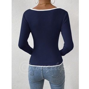 Navy Blue Rib Knit Sweetheart Neck Contrast White Trim