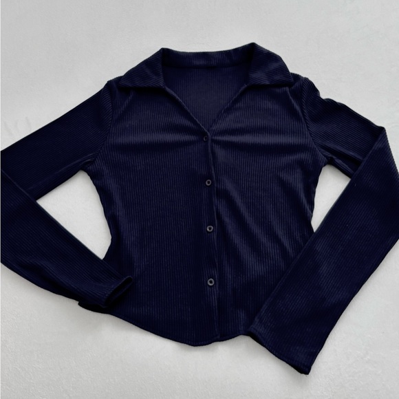Navy long sleeve ribbed top Button Down Cardigan Stylish navy blue ribbed button-up top with long sleeves. Perfect for casual or formal wear.