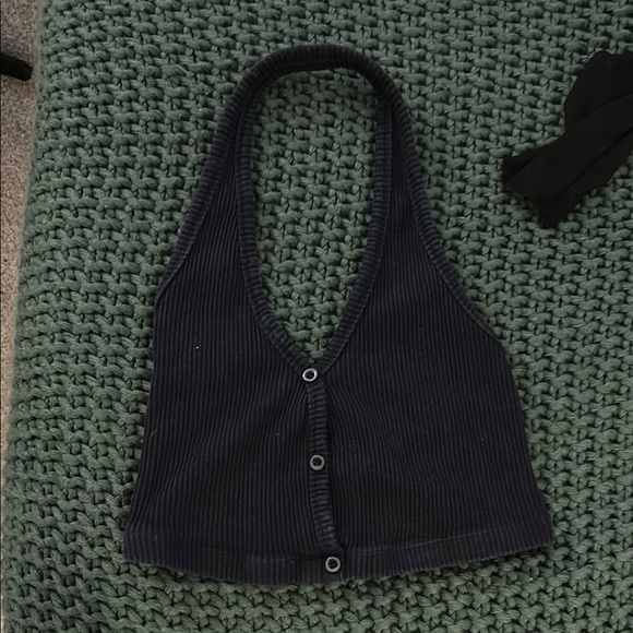 Stylish navy blue ribbed crop top with a halter neck design. Perfect for casual outings or layering.