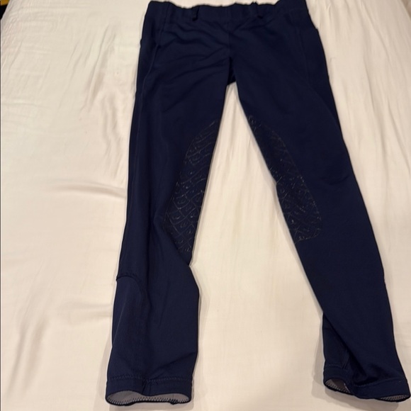 Stylish navy blue riding pants with reinforced knee patches. Perfect for equestrian activities.
