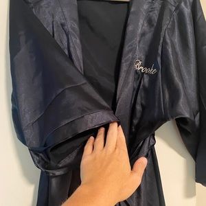Silk like material. With tie around the waist. Monogrammed with the name Brooke. Navy blue with white embroidery. Great condition, only worn once on the wedding day. Smoke free home.