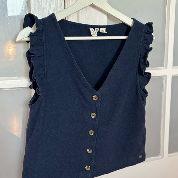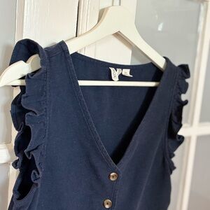 Navy blue top with ruffle sleeves and button-down front. Size S, 70% cotton 30% polyester
