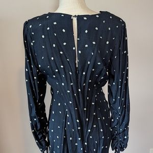 This dress is ruched across the front that you can rearrange use the tie in the bottom. It has a pattern that is like polka dots (not exactly curricular). Long sleeved, size 6!