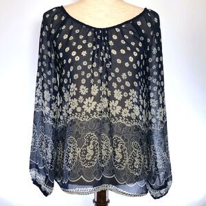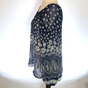 Navy Blue Sheer Boho Floral Pleated Women's Top