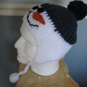 Navy Blue Snowman Hand Knit Hat / Unisex Child / Earflaps, Ties, Pom Pom's -SALE
