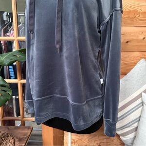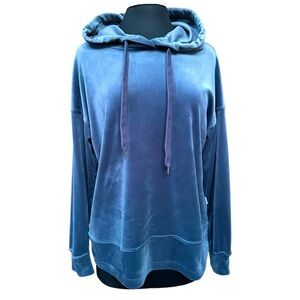 Indulge in comfort with this luxurious velour hoodie in a beautiful blue-grey shade. Features a classic pullover style with a drawstring hood. The soft, plush fabric makes it ideal for cozy days at home or elevated casual outfits. Great condition!