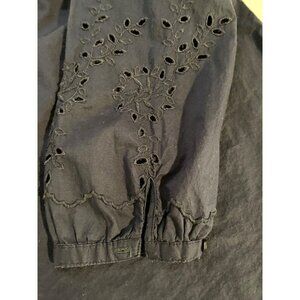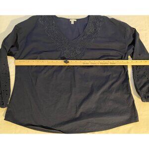 This navy blue top features a delicate floral embroidery detail on the V-neck and sleeves, offering a touch of elegance and sophistication. Pre-owned in good condition. We apologize for the lighting on a few pictures. The top is Navy blue!