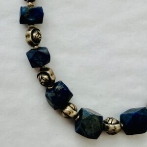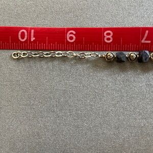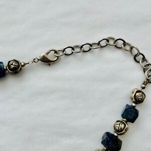 These rough-cut stone beads are separated by decorated silver-toned beads. Length to the closest jump ring is a little more than 8". Lobster clasp.