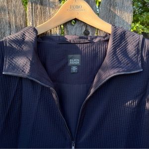 Gorgeous light jacket with hood by Eileen Fisher. Dark navy blue. Textured stripe fabric. Excellent condition. Inside lining has rip above inside pocket. See picture. Size M.