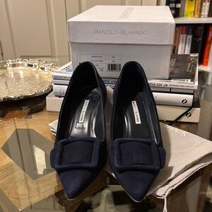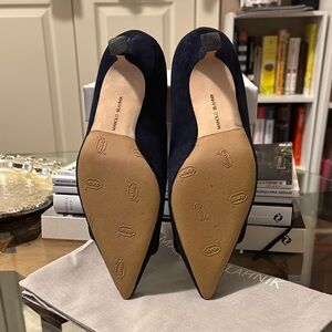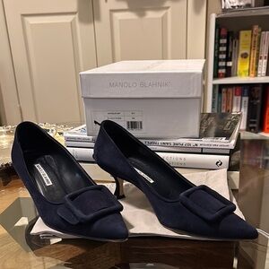 Elegant navy blue suede pumps featuring a stylish buckle. Perfect for adding a touch of sophistication to any outfit. Rubber was put on the soles by a shoe cobbler to extend the shoe life. Only worn 3x. Size 38.5. Comes with original box and dust bag!
