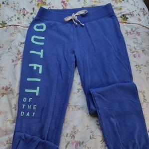 Loose sweatpants with light blue writing on the side. White drawstring on the front. Used in Good Condition.