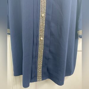 Elegant navy blue tunic featuring gold trim and button details. Perfect for a stylish look.