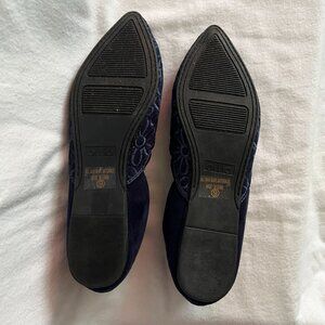 These ‘ballet’ shoes are a faux navy blue suede. These are a comfortable pointed toe flat shoe with a floral embroidered design on the top. They are considered a ‘ballet’ type shoe (Ballet flats are derived from a woman’s soft ballet shoe with a very thin heel.) They have a black rubber sole.