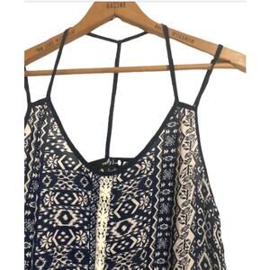 Navy and white tank top with a floral geometric pattern. Crochet design along the front and back. Thin straps, with a racerback style. Swing bottom. In gently used condition.