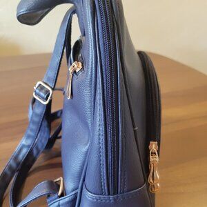 One zip pocket on front and one in back. Two zip pockets inside. Rose gold toned hardware.