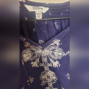 Stylish navy blue women's top featuring an elegant white pattern. Perfect for casual outings or a day at the office.