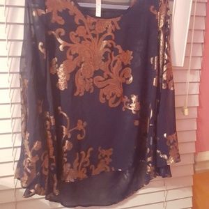 Navy blue and gold womens size small sheer blouse, with bell flare sleeves- Best worn with a navy blue cami (not included)