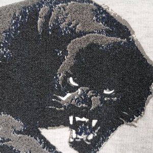 Heather gray varsity jacket with navy blue accents team Santiago with a raging panther appliqué on the back. The jacket is made of fleece fabric which shows little evidence or wear. The jacket is an oversized XS. It is meant to be worn loosely-fitted. Navy blue metal snap front closure. Two diagonal slash pockets in front.