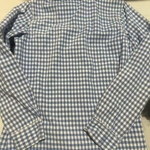 This classic button-down shirt features a timeless navy blue and white gingham pattern, crafted from lightweight cotton for a comfortable fit. Its versatile design makes it perfect for casual occasions, offering a stylish and traditional look.
