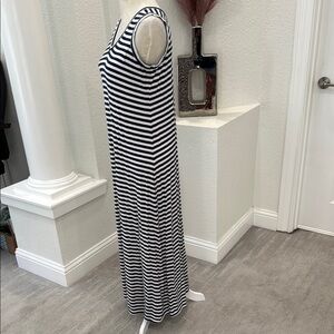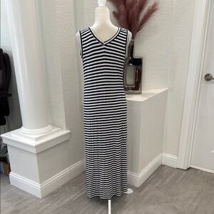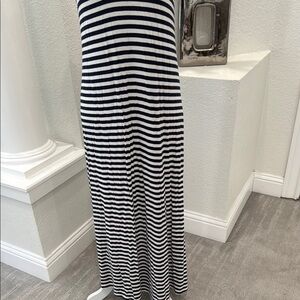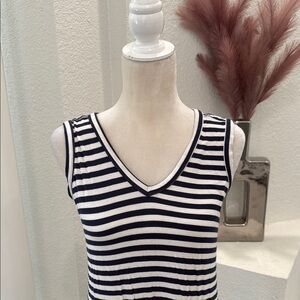 Stylish navy and white striped maxi dress. Sleeveless with a V-neck design. Very stretchy, soft and comfortable. Very light wear but hardly noticeable, please see pictures.