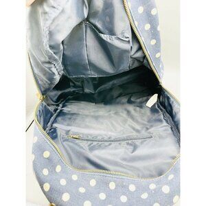 Navy Blue w White Polka Dots Backpack Cream Sparkle Trim Brown Faux Leather. Like new