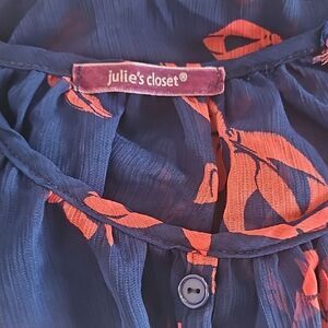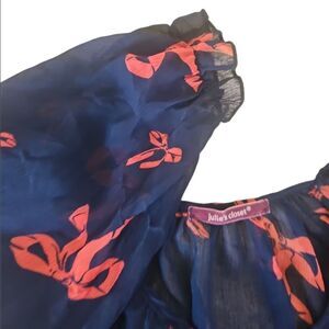 Chic navy blue blouse featuring a playful red bow print. Perfect for casual outings.