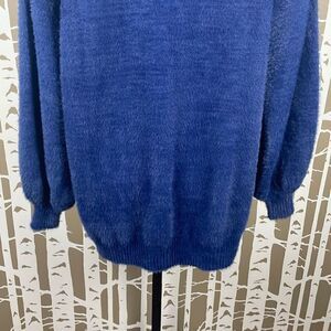 Navy Blue Fuzzy Soft Knit Oversized Mock Neck Balloon Sleeve Sweater sz M. Features fuzzy, ultra soft and cozy navy blue 100% nylon knit, mock neckline, banded cuffs & hemline, voluminous balloon drop style sleeves, longline fit. Brand new without tags and no flaws - this would make a great gift!