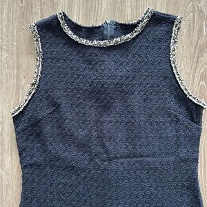 This stunning blue mini dress features a sleek sheath silhouette. The sleeveless design and mock neck add a touch of elegance, while the structured fabric ensures a flattering fit. Great condition, size XS